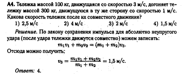 Закон сохранения импульса: в инерциальной системе отсчёта суммарный импульс замкнутой системы тел остаётся постоянным при любых взаимодействиях тел системы между собой. $$ m_{1}V_{1x}+m_{2}V_{2x}=m_{1}U_{1x}+m_{2}U_{2x} $$